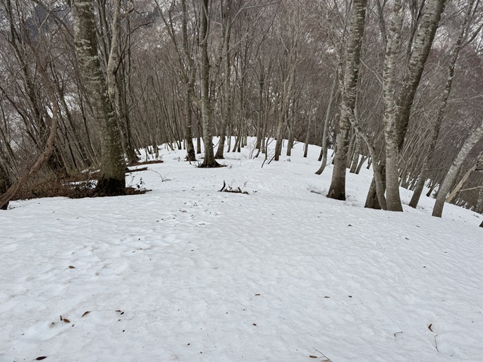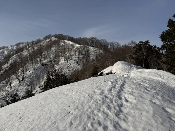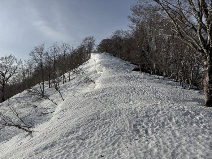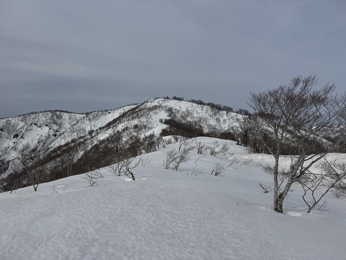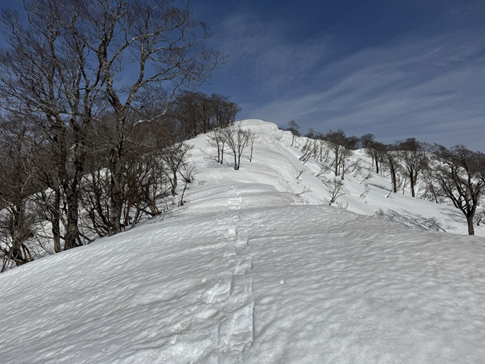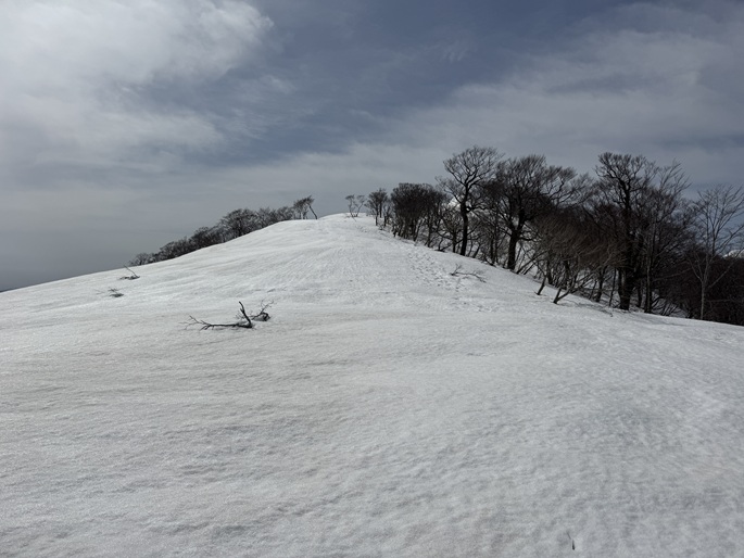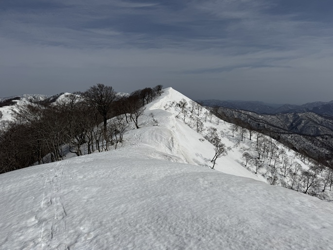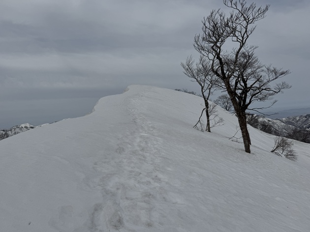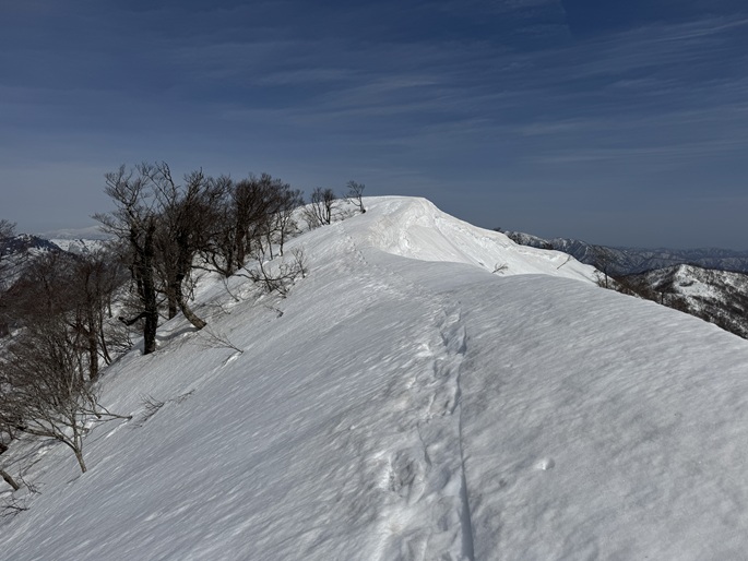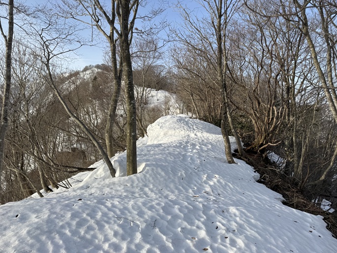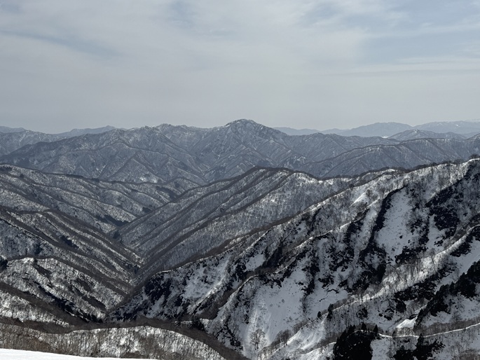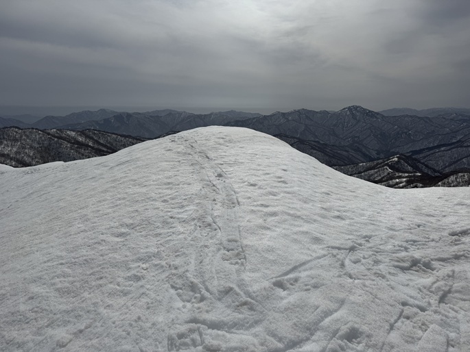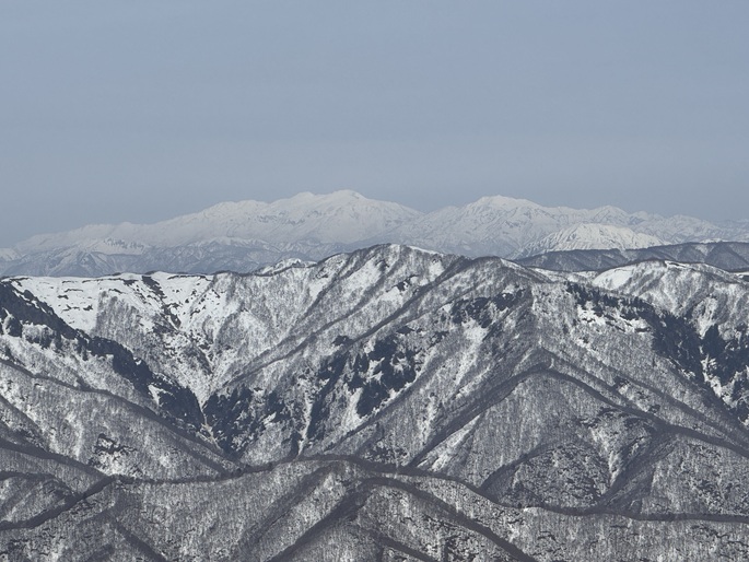 核心の渡渉は登りの水位が膝と股の間、気温が上がる下りは股下近くで、安全に渡るにはギリギリの深さだった。 山の積雪は充分あり藪漕ぎは皆無だったが、連休中続いた季節外れの高温で一気に雪が緩み、登り始めから1時間半ほどの所からスノーシューを履くことになり、重たい雪と踏み抜きで苦労した。 登り返しが多いため取付きからの累積標高差は1600mほどあり、渡渉の手間もあったことで11時間ほどの時間を要した。 渡渉は安価な胴長を初めて使ったが、雪解け水の冷たさは全く感じず、そのコスパの高さに驚かされた。 薮のない稜線上は終始展望が良く、連休直後だったことで山は終日貸し切りだった。