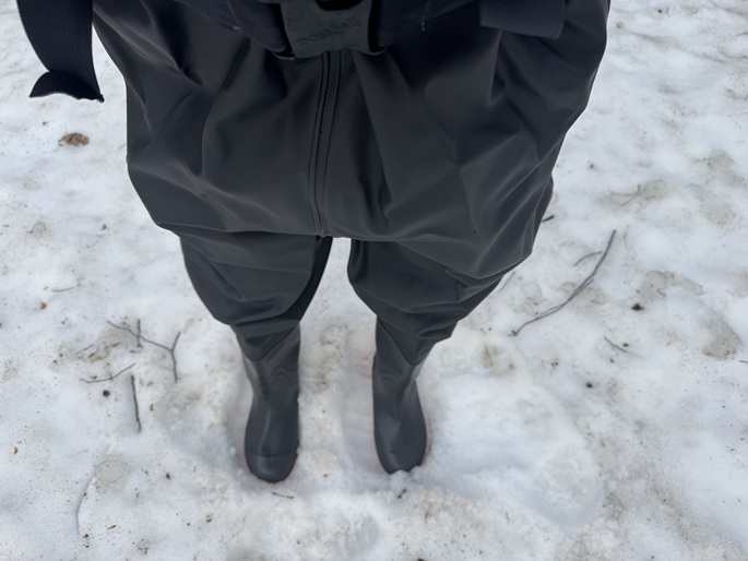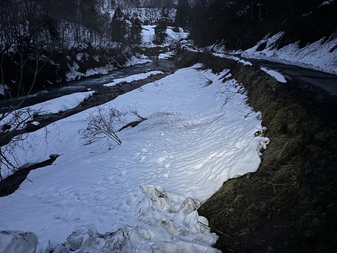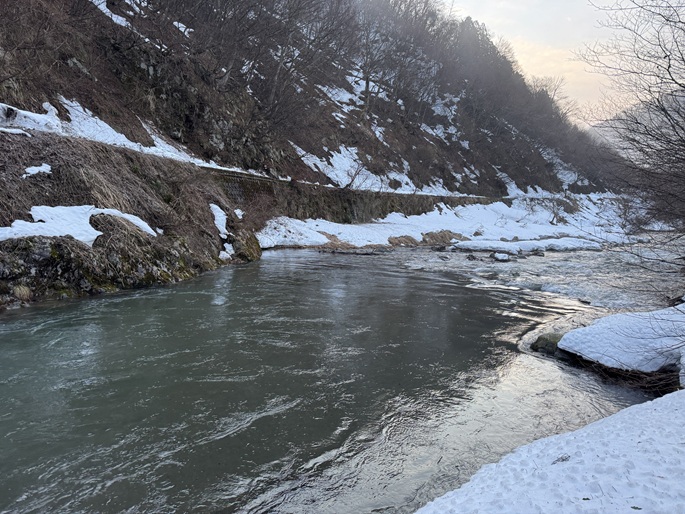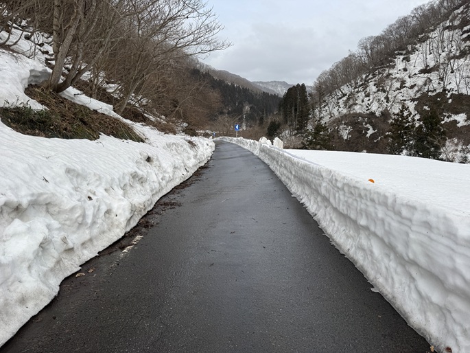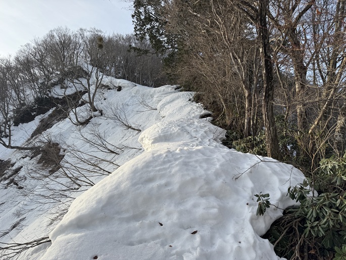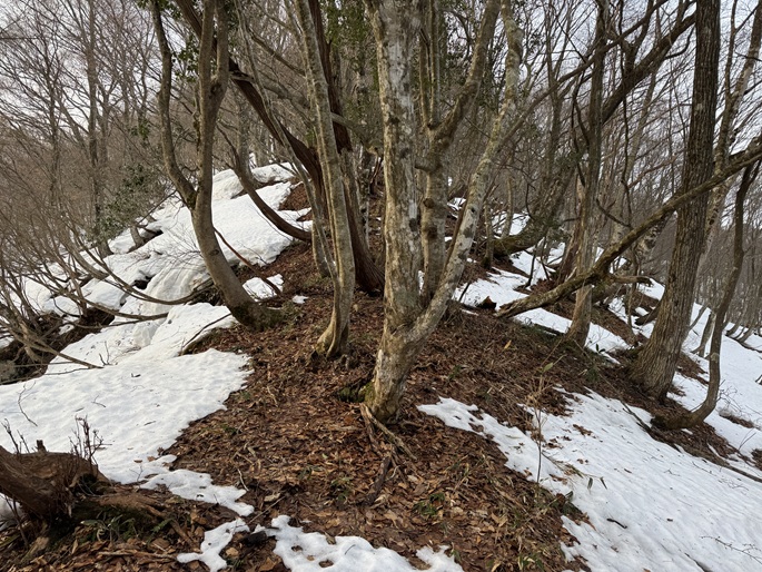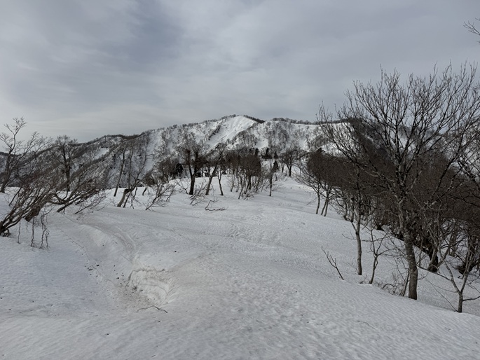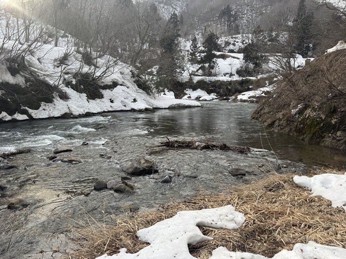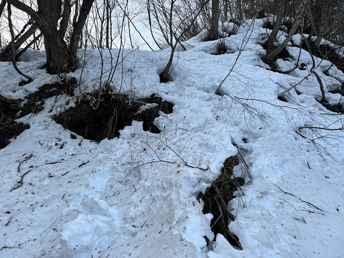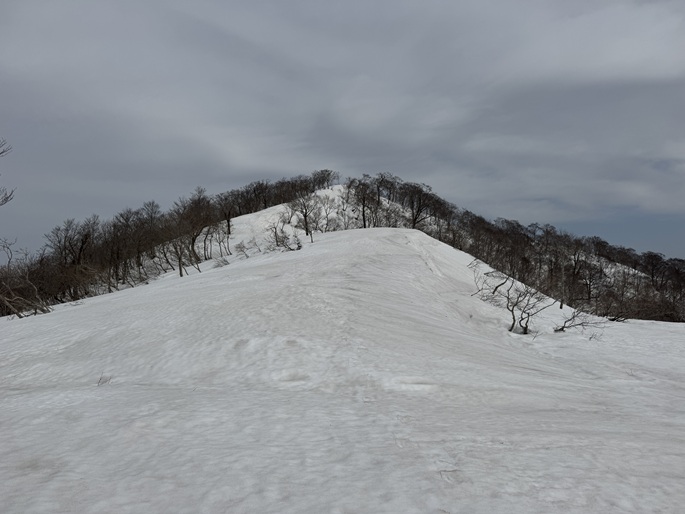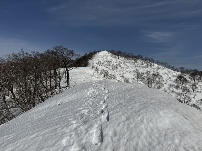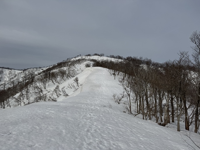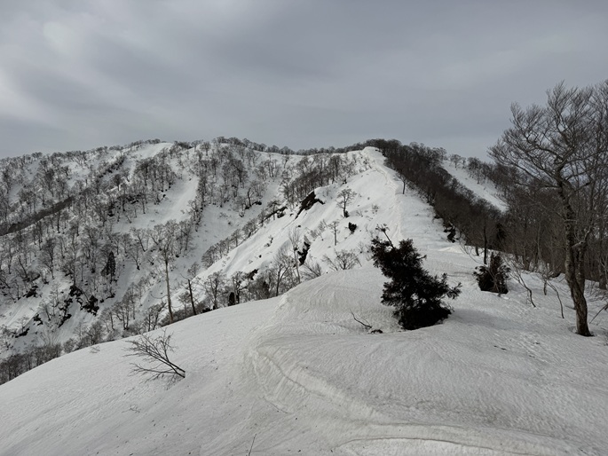 核心の渡渉は登りの水位が膝と股の間、気温が上がる下りは股下近くで、安全に渡るにはギリギリの深さだった。 山の積雪は充分あり藪漕ぎは皆無だったが、連休中続いた季節外れの高温で一気に雪が緩み、登り始めから1時間半ほどの所からスノーシューを履くことになり、重たい雪と踏み抜きで苦労した。 登り返しが多いため取付きからの累積標高差は1600mほどあり、渡渉の手間もあったことで11時間ほどの時間を要した。 渡渉は安価な胴長を初めて使ったが、雪解け水の冷たさは全く感じず、そのコスパの高さに驚かされた。 薮のない稜線上は終始展望が良く、連休直後だったことで山は終日貸し切りだった。