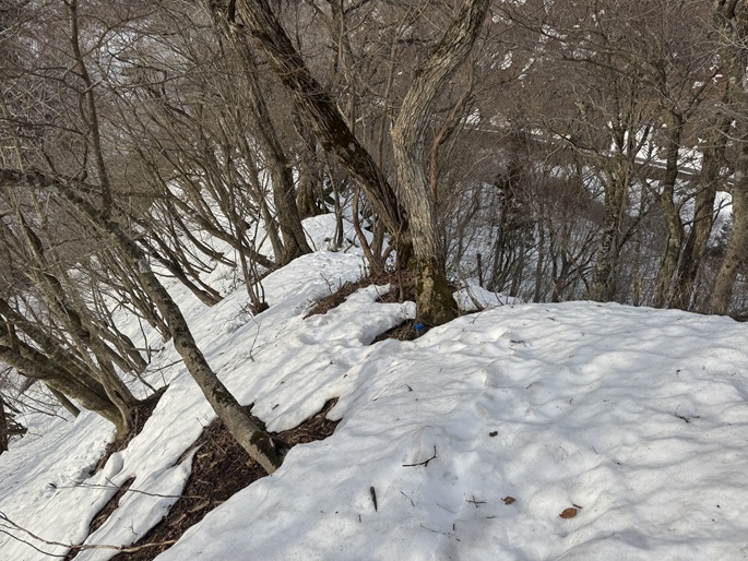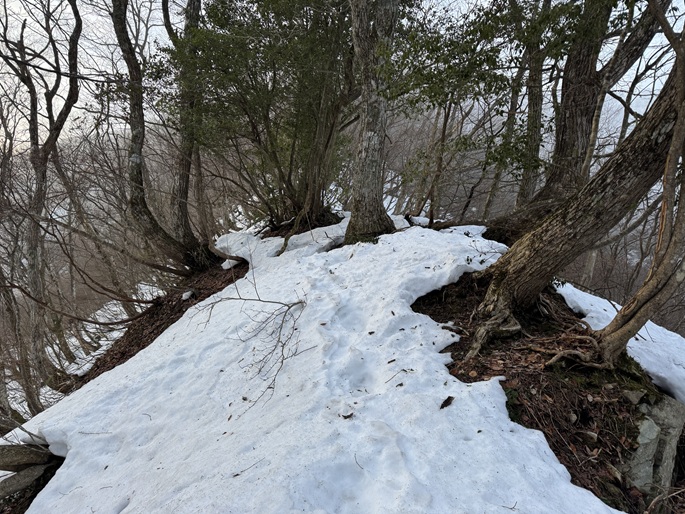 岐阜県揖斐川町の不動山(1240m*ぎふ百山)を尾根続きの千回沢山(1245m*ぎふ百山)を経て登った。 不動山はぎふ百山の中では最難関と思われる山で、登山道がないため以前は無雪期に沢から薮を漕いで登られていたが、2年前に開通した冠山トンネルの恩恵で積雪期にも日帰りで登れるようになった。 冬ルートは専ら顕著な尾根歩きだが、取付きに渡渉があるため山の雪のコンディションと雪解けによる川の増水のタイミングを見極めることが必須だった。 今回はいずれの条件も決して良くはなかったが、連休中の入山者のタイムリーな情報に恵まれて登頂が叶った。